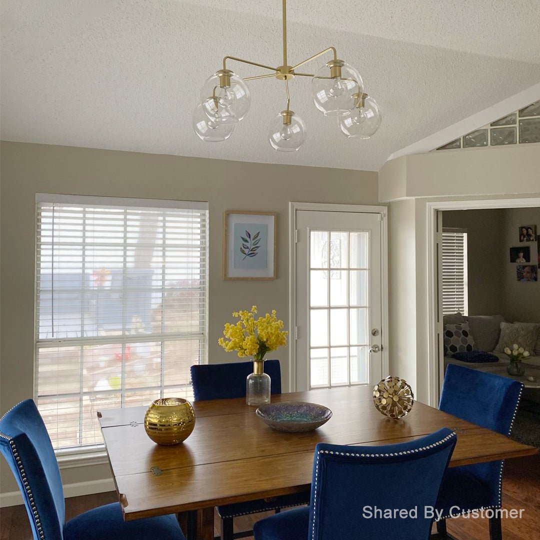 Versatile Lighting: With its five-light configuration, this chandelier provides ample illumination for various settings, from dining rooms and living rooms to entryways and foyers. The soft, diffused light emitted by the blown glass globes creates a warm and inviting ambiance that enhances the atmosphere of any room.